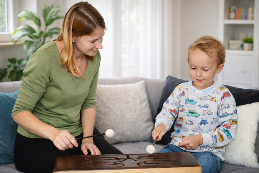 Abhängig von Zielsetzung und Alter ist es von Vorteil, wenn die Bezugsperson gemeinsam mit dem Kind an der Musiktherapie teilnimmt. Dadurch ist eine Begegnung auf Augenhöhe und das spielerische Erleben von neuen Erfahrungen möglich.